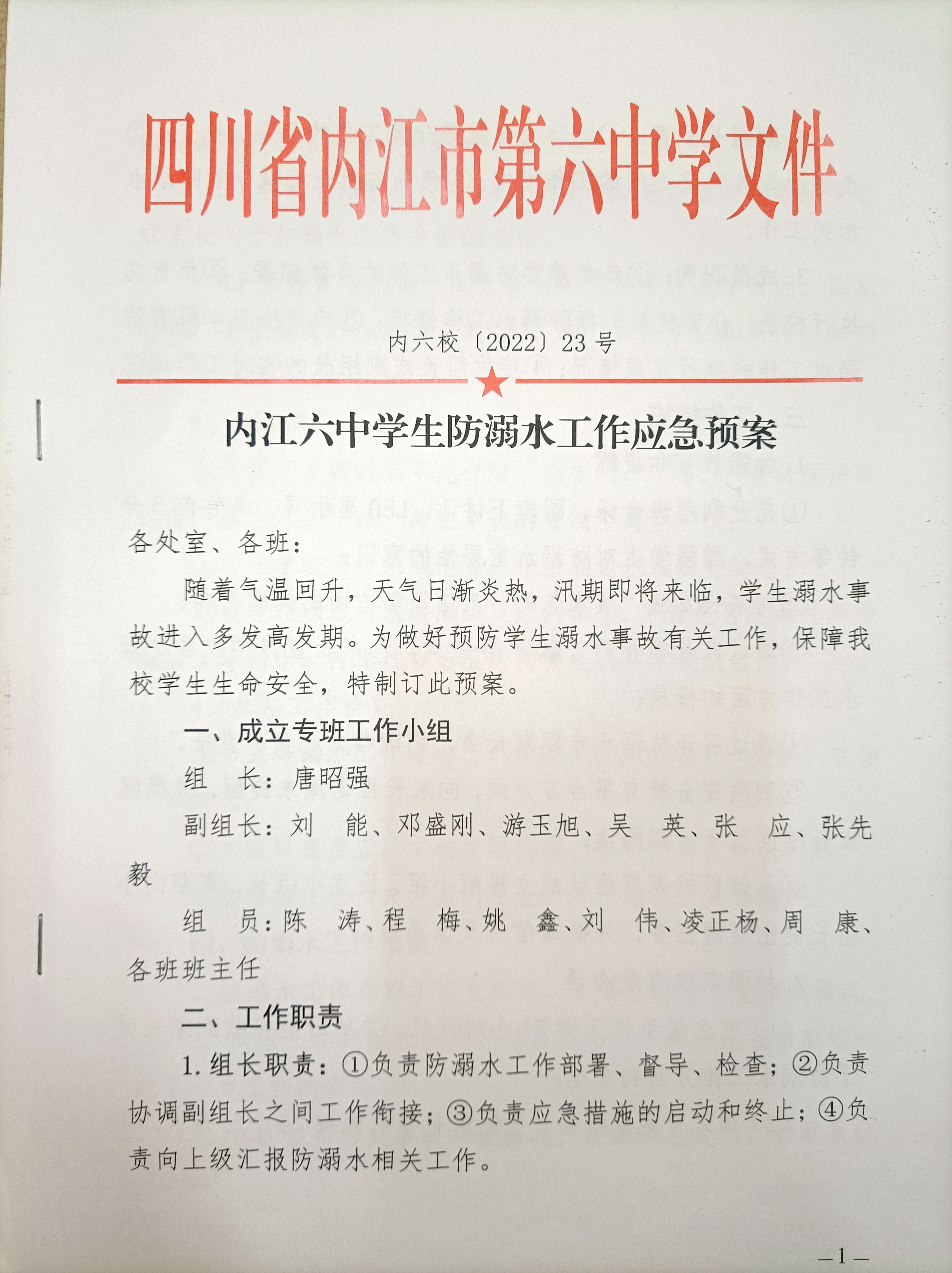 根据我校实际情况制定了《内江六中学生防溺水工作应急预案》,成立了防溺水安全工作领导小组,学校多次召开防溺水专题安全行政干部工作会、班主任防溺水专题安全工作会等,全面明确干部、班主任及教师的工作职责,制定详细工作措施,强化责任落实,确保学校安全监管责任明晰到位。