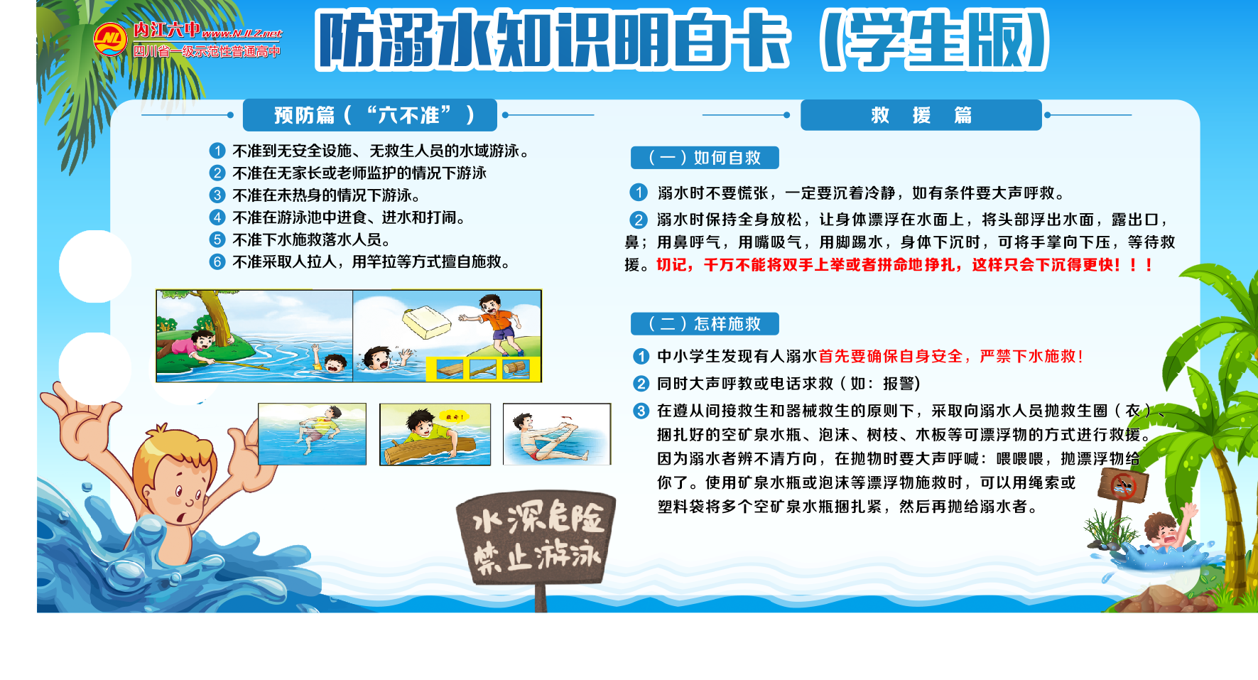 时序变迁,立夏将至,气温骤增,防溺水又成了我们必须高度关注的工作。四川省教育厅、内江市教育局针对此项工作发布了相关函件和通知。按照上级部署和要求,内江六中从制定预案、强化宣传、家校共育三方面采取措施,细化分工,做实做细防溺水安全教育,排查安全隐患,落实监管责任,筑牢学校、家庭、社会三位一体的防溺水“安全网”,最大限度保障学生生命安全。