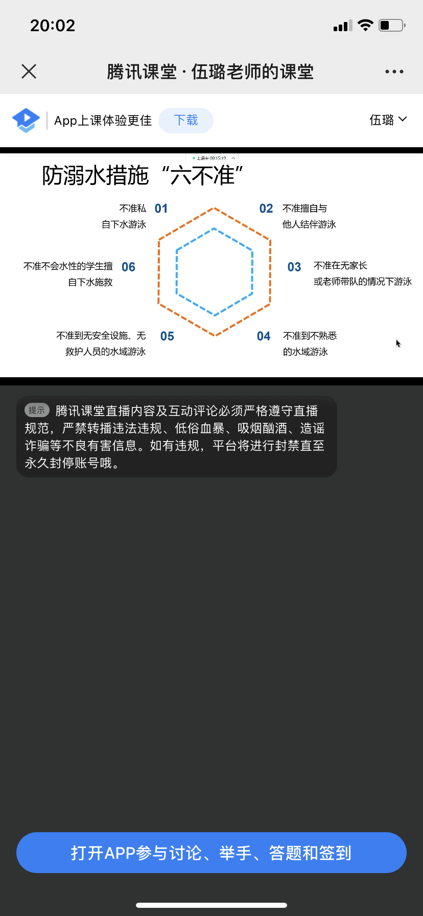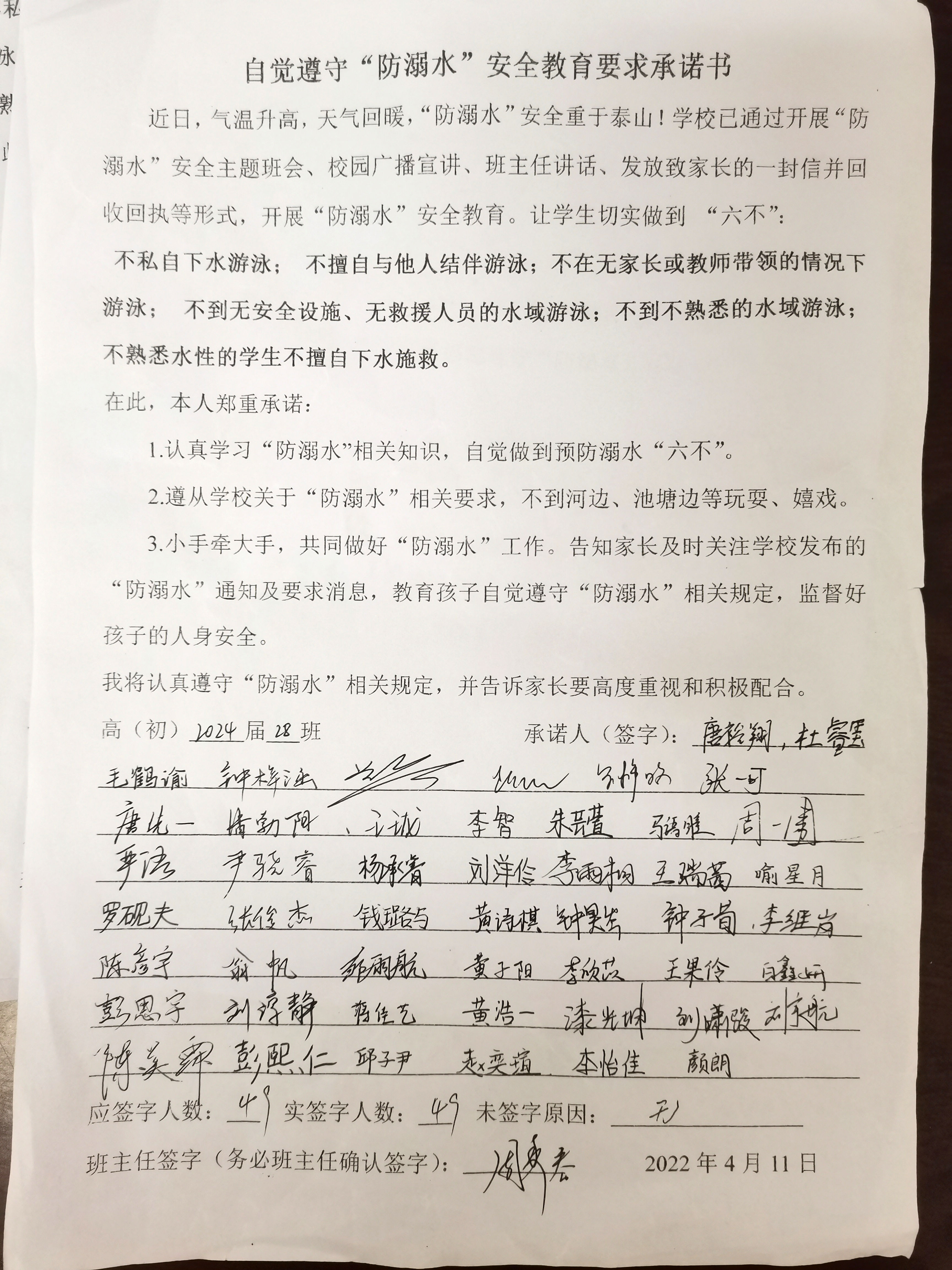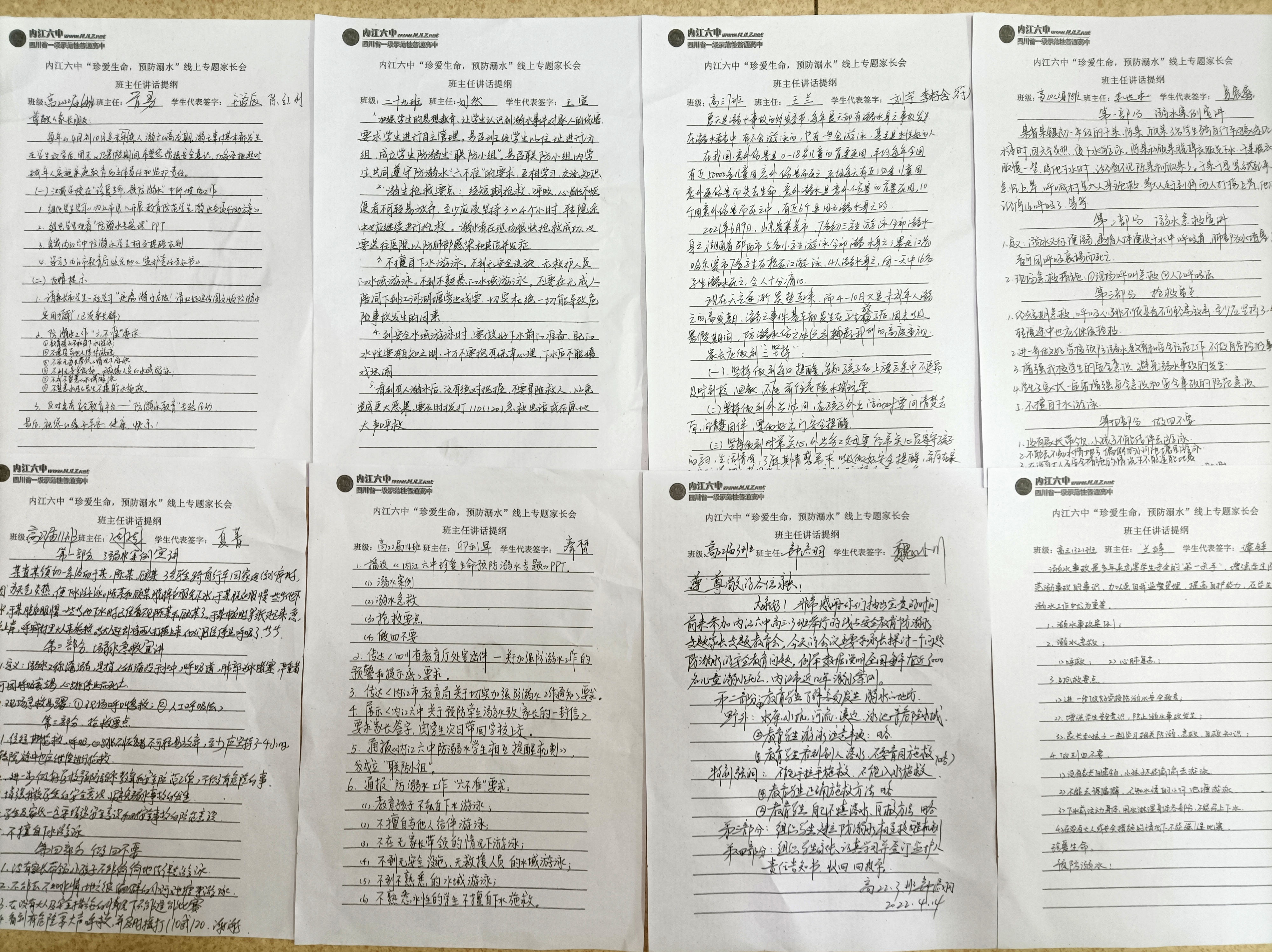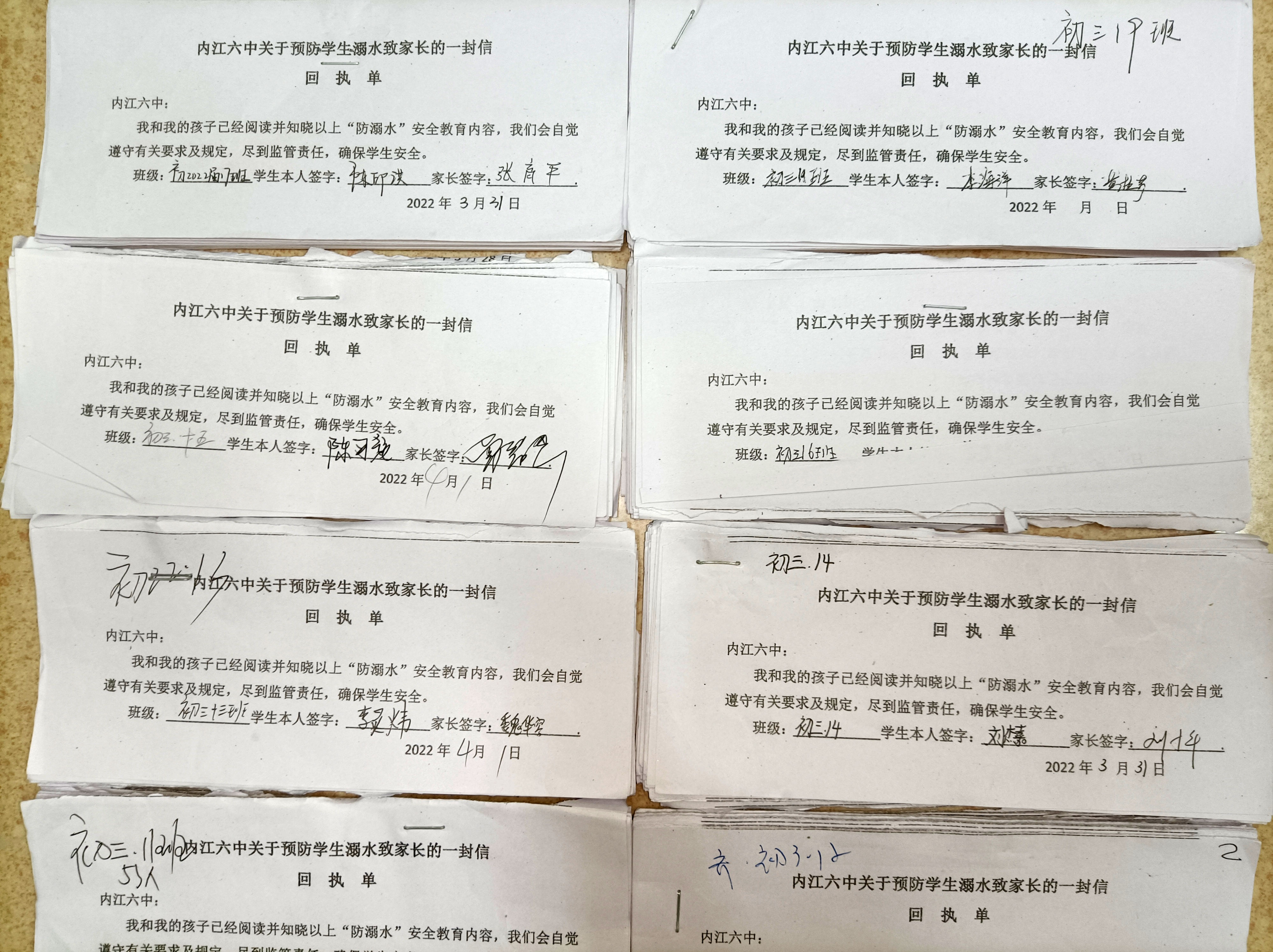 学校三次发放《防溺水致家长的一封信》,并与家长签订了《防溺水安全责任告知书》。在4月11日——4月13日期间,各班组织召开了“珍爱生命 预防溺水”为主题的专题防溺水线上家长会。进一步明确家长的监管职责,提高防溺水安全的防范观念和责任意识;建立完善学生相互提醒机制,各班利用班级家长微信群、QQ群等平台,发布预防溺水每日提醒,密切家校联系,落实好学生平安“日报制”,全天候、全方位、无死角的保障学生安全。在上下学、周末离校前通过校讯通信息,班主任通过班级QQ群、微信群再次提醒家长密切关注孩子在周末假期的动向,形成家校共育合力,采取防范措施,确保学生不去危险水域、不私自下河游泳。
